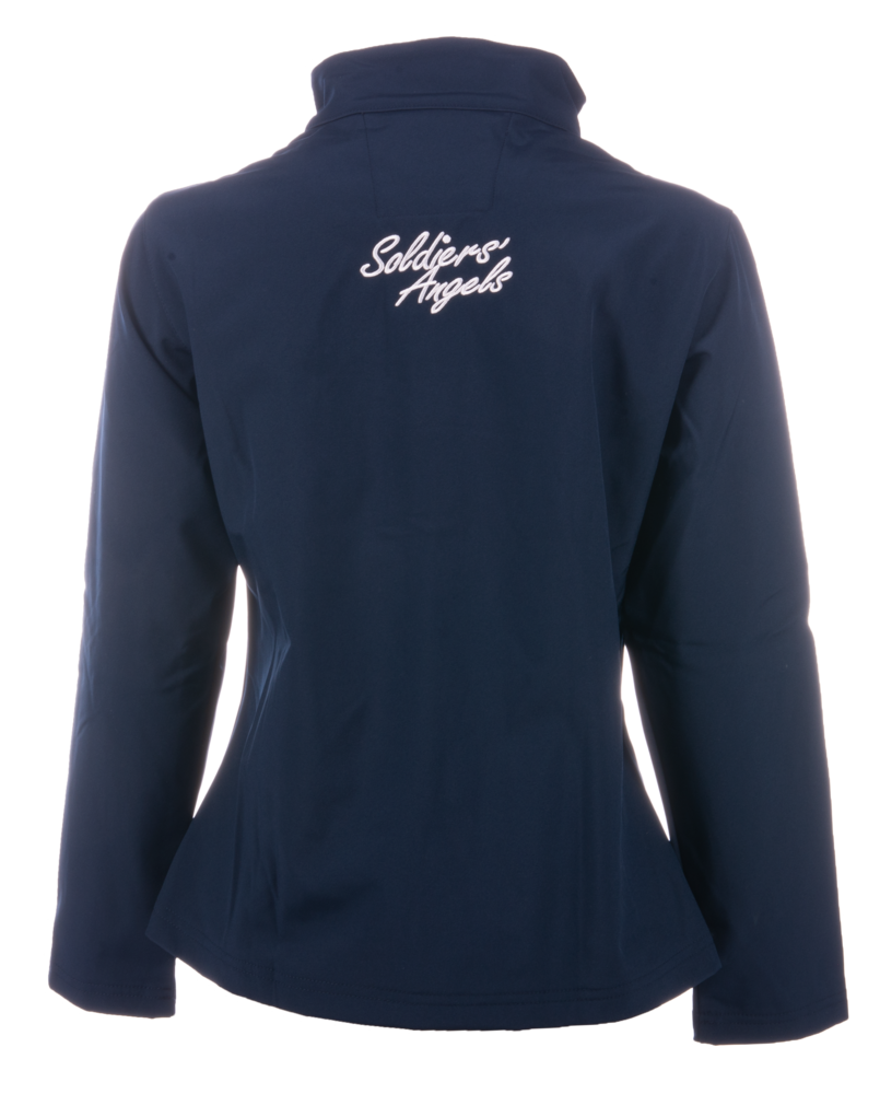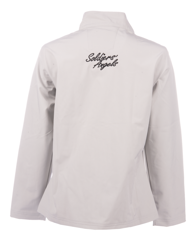 The left chest proudly displays the full-color embroidered Soldiers’ Angels logo, while the back features “Soldiers’ Angels” in bold lettering across the shoulders—white on the Silver jacket, and black on the Navy and Charcoal options.