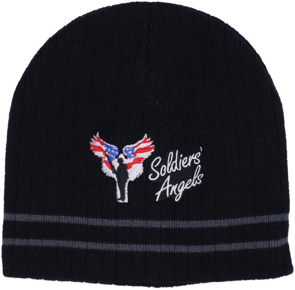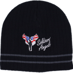 Our Soldiers' Angels beanie is more than just a cold-weather essential—it's a symbol of support for our heroes. This cozy black knit beanie features sleek gray stripes and proudly displays the embroidered Soldiers’ Angels logo and name on the front for a polished, high-quality finish.