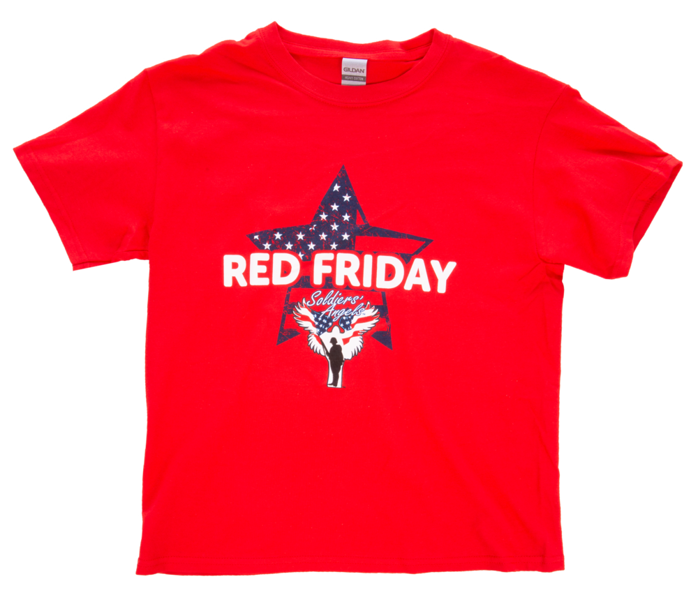 • Features a patriotic star, “RED FRIDAY,” and Soldiers’ Angels logo